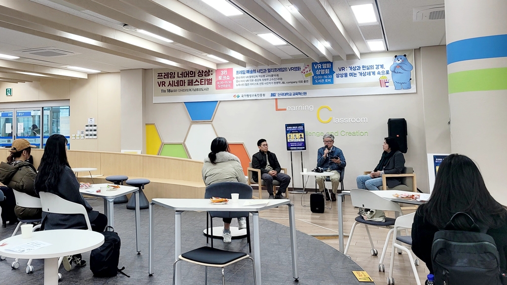 교육혁신원(원장 노지현)은 지난 18일(화) 죽전캠퍼스 퇴계기념중앙도서관에서 ‘프레임 너머의 상상: 단국대 VR 시네마 페스티벌’을 개최했다. 이번 행사는 가상현실(VR) 기술을 기반으로 실감형 영화와 미디어아트의 새로운 가능성을 탐색하며, 영상 예술의 미래 패러다임을 제시한 문화 프로그램으로 재학생들의 큰 관심을 모았다. ▲ 교육혁신원은 ‘프레임 너머의 상상: VR 시네마 페스티벌’을 개최 했다. 페스티벌은 ‘VR 토크쇼’와 ‘VR 상영회’ 두 세션으로 진행됐다. 퇴계기념중앙도서관 도산라운지에서 열린 VR 토크쇼에서는 국내 VR 콘텐츠 제작을 이끄는 전문가들이 참여해 실감형 영상예술의 현재와 미래를 논의했다. 이어 중앙도서관 로비에서는 관람객들이 마치 공간 속으로 직접 들어가는 듯한 몰입형 VR 영화 체험이 마련돼 눈길을 끌었다. 초청 연사로는 VR 뮤지컬 SF 영화 안나 마리(Anna Marie) 의 촬영을 맡은 백승범 촬영감독(홍익대 교수)과 정영혁 J&L Company 대표가 참여했다. 백 감독은 “VR 영화 감상은 스크린을 바라보는 수준을 넘어, 관객이 공간과 감정 속으로 직접 참여하는 경험으로 확장되고 있다”고 강조했다. 정영혁 대표는 디지털 기술과 공간예술의 융합을 통해 관객이 능동적으로 참여하는 새로운 콘텐츠의 가능성을 제시했다. 노지현 원장은 “이번 페스티벌은 예술과 과학이 만나는 융합의 장이자, 개인의 감정과 창의성이 어떻게 시각적으로 구현되는지 확인할 수 있는 의미 있는 시도”라며 “VR·AI·미디어아트 등 뉴미디어 기반의 디지털 융합교육을 확대해 학생들이 상상력과 기술을 결합한 창의적 콘텐츠를 개발할 수 있도록 적극 지원하겠다”고 말했다. #단국대 #교육혁신원 #VR시네마페스티벌 [대학뉴스 제보] 죽전 홍보팀 : 031-8005-2032~5, 천안 홍보팀 : 041-550-1061