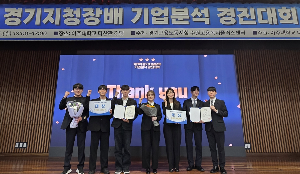 우리 대학 재학생팀이 지난 5일 고용노동부 경기지청이 주최한 「2025 고용노동부 경기지청장배 기업분석 경진대회」에서 대상과 동상을 수상했다. 이번 대회는 경기지역 대학생들의 산업 이해도 제고와 진로 탐색을 지원하기 위해 마련됐다. 우리 대학 재학생팀은 ▲대상 (인듐스텔라팀, 윤진영 학생 외 2명) ▲동상(포스팀, 윤예림 학생 외 3명) 등 우수한 성적을 거뒀다. ▲우리 대학 재학생팀이 고용노동부 경기지청장배 기업분석 경진대회에서 수상을 하고 기념촬영을 했다. 대상을 수상한 ‘인듐스텔라팀’은 반도체 검사장비 전문기업인 ㈜넥스틴을 분석해 ▲사업구조 ▲성장전략 ▲재무현황 ▲인재상 등을 분석했다. 특히 산업 트렌드와 기업 비전 간의 연계성을 체계적으로 분석해 심사위원단으로부터 높은 평가를 받았다. 동상을 수상한 ‘포스팀’은 특수목적용 기계 제조 기업인 피에스케이(주)를 분석해 ▲기술력 ▲시장 경쟁력 ▲ESG경영활동 등을 분석했다. 데이터 분석과 뛰어난 발표력, 협업 역량을 인정받으며 수상의 영예를 안았다. 이러한 학생들의 성과에는 취창업지원처 대학일자리플러스센터의 체계적인 지원 프로그램이 있었다. 센터는 교내 기업 분석 경진대회를 통해 대표팀을 선발하고, 본선 참가를 위해 3주간 ▲기업직무분석 특강 ▲멘토링 ▲모의 발표회 ▲기업 담당자 초청 피드백 ▲PT 전문가 개별지도 등 맞춤형 지원을 제공했다. 민동원 취창업지원처장(겸 대학일자리플러스센터장)은 “짧은 준비 기간에도 뛰어난 분석력과 팀워크를 보여준 학생들이 자랑스럽다”라며 “앞으로도 실전형 취업 지원 프로그램을 확대해 학생들이 산업 현장을 이해하고 진로를 구체화할 수 있도록 적극 지원하겠다”라고 밝혔다.