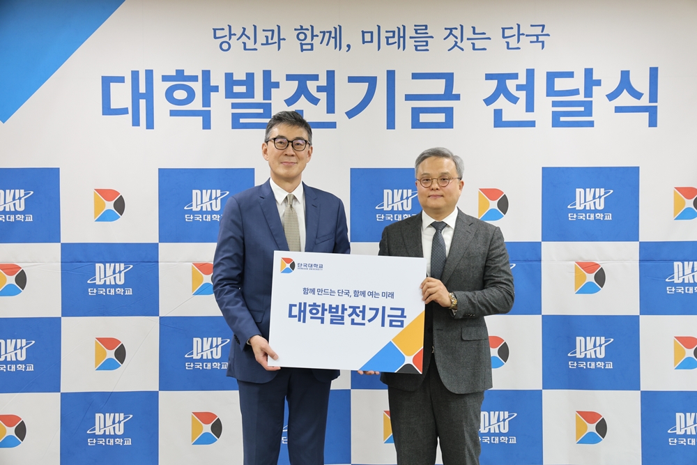 신세계마취통증의학과의원을 운영하는 의과대학 동문 5명이 대학 발전을 위해 5천만 원을 기부했다. 누적 기부액은 1억 7천만 원에 달한다. △ 이정민 동문(오른쪽)이 김재일 대외부총장에게 발전기금을 전달하고 기념촬영을 하고 있다. 기부에 동참한 동문은 우리 대학 의과대학을 졸업한 ▲이정민 동문(92학번) ▲조덕현 동문(93학번) ▲최금호 동문(94학번) ▲강승환 동문(95학번) ▲박상욱 동문(96학번) 등 총 5명. 이들은 현재 신세계마취통증의학과의원 4개 지점(천안 본점, 천안 쌍용점, 인천 계양점, 화성 병점점)을 운영하며 2013년부터 꾸준히 대학에 발전기금을 기부해 왔다. 발전기금 전달식은 지난 27일(목) 죽전캠퍼스 범정관에서 열렸다. 기부식에는 이정민 동문(92학번)이 대표로 참석했다. 기부금은 대학 발전과 의과대학 마취통증의학교실 지원에 사용될 예정이다. 이정민 동문은 "사회 각계에서 활약하는 단국인들이 모교와 후배들을 위해 더 많은 기회를 나눌 수 있기를 바라며 우리의 지속적인 응원이 대학 발전에 새로운 동력이 되기를 희망한다"고 밝혔다. 김재일 대외부총장은 "꾸준한 기부로 대학 발전에 동참해준 동문들께 깊이 감사드린다"며 "전해주신 소중한 뜻은 훌륭한 의료 인재 양성을 위해 값지게 사용하겠다"고 말했다. △ 2021년 5월 '신세계마취통증의학과 강의실' 현판식 기념사진(왼쪽부터 최금호, 조덕현, 이정민, 박상욱, 강승환 동문) 한편, 우리 대학은 2021년 5월 이들 동문 네트워크의 누적 발전기금 1억 1천만 원 달성을 기념해 의학관 434호를 '신세계마취통증의학과 강의실'로 지정하고 현판식을 진행한 바 있다. [대학뉴스 제보] 죽전 홍보팀 : 031-8005-2032~5, 천안 홍보팀 : 041-550-1061