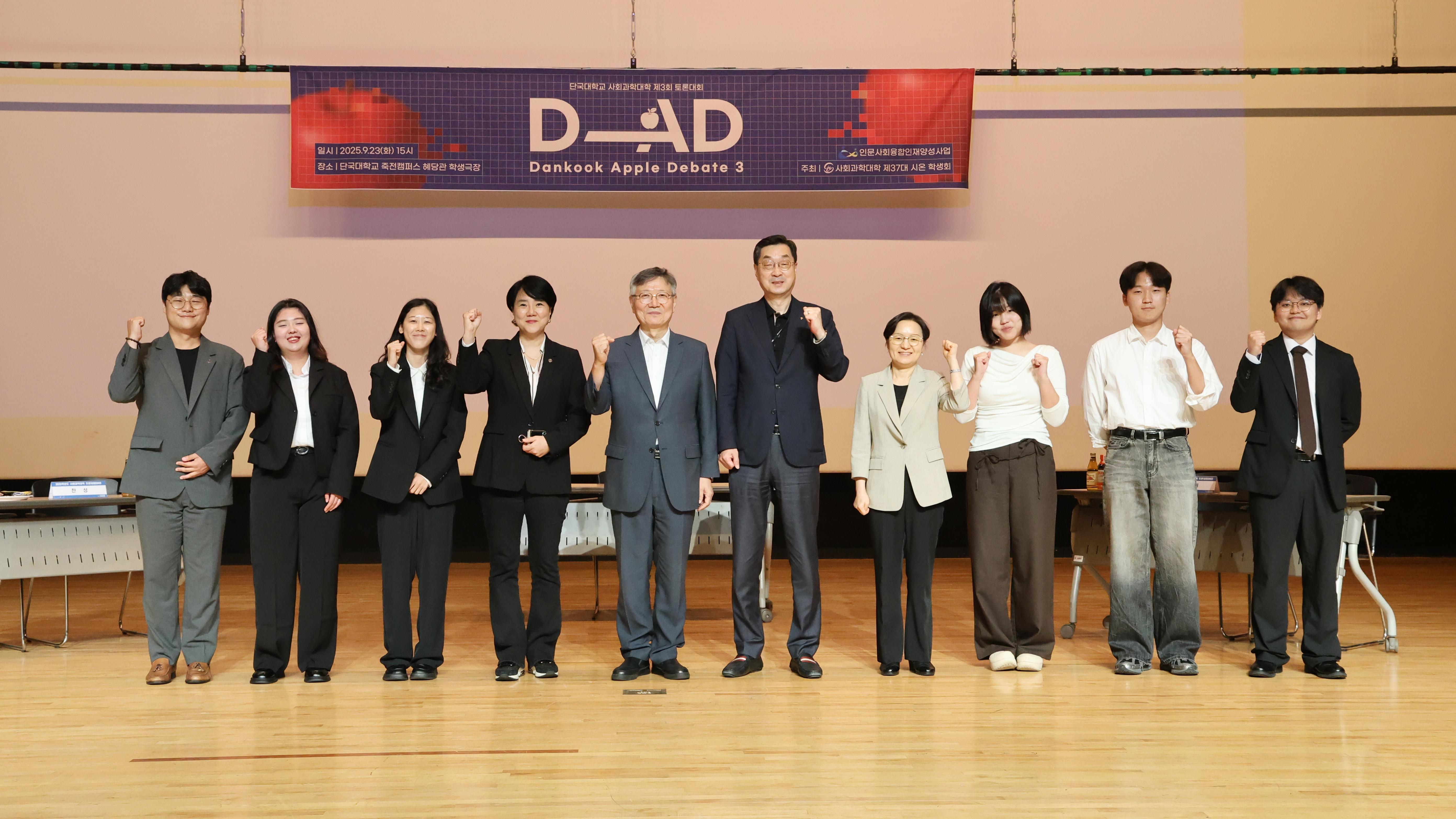 사회구조변화대응융합인재양성사업단(단장 유현실, 이하 사업단)이 사회과학대학생회와 함께 토론대회 ‘DAD(Dankook Apple Debate)’와 HUSS 아카데미 시민강좌 「AI 광풍시대, 자녀교육 어떻게 해야 하나?」를 연이어 개최하며 큰 호응을 얻었다. 지난 23일(화) 죽전캠퍼스 학생극장에서 열린 사회과학대학 토론대회 ‘DAD(Dankook Apple Debate)’에서는 구독자 281만명을 보유한 인기 유튜버 정재형(피식대학 채널)씨가 특강을 진행해 학생들의 열띤 반응을 이끌었다. 심사위원 서호 전 통일부 차관은 "오늘 토론은 우리나라가 직면한 인권, 안보, 경제라는 중요한 주제를 깊이 탐구하고, 청년의 시선으로 미래지향적 관점을 제시하는 소중한 자리이다"라며 "서로의 의견을 경청하고 청년들의 토론 문화가 더욱 확산되는 계기가 되길 바란다" 라고 축사를 전했다. ▲ 사업단과 사회과학대학 학생회가 함께 개최한 사회과학대학 토론대회 ‘DAD(Dankook Apple Debate)’에 참석한 단체 사진 ▲ 서호 전 통일부 차관(왼쪽 첫번째)이 토론대회에서 수상한 학생들과 기념촬영을 하고 있다. 이어 토론대회는 ‘대한민국은 경제적 이익 및 안보 외교보다 인권 외교를 우선시해야 한다’는 주제로 찬반 토론이 펼쳐졌다. 대회 결과 ▲최우수상은 나노팀[나수현(법학과 4학년), 노하늘(법학과 3학년)] ▲우수상은 정승제팀[이정미(기계공학과 2학년), 신승태(법학과 2학년)]이 수상했다. 이어 24일(수)에는 죽전캠퍼스 인문관 소극장에서 아카데미 시민강좌 「AI 광풍시대, 자녀교육 어떻게 해야 하나?」를 개최했다. 이번 강좌는 급변하는 AI 환경 속에서 자녀교육의 새로운 방향을 모색하고자 기획됐다. ▲ 유현실 단장이 시민들을 대상으로 「AI 광풍시대, 자녀교육 어떻게 해야 하나?」를 주제로 강연을 진행하고 있다. 강연자로 나선 유현실 단장(상담학과)는 AI 시대에 필요한 5가지 힘으로 적응력, 탐험력, 질문력, 교감력, 결정력을 제시하며 “AI가 대체할 수 없는 인간 고유의 역량을 길러야 한다”고 강조했다. 이어 유현실 단장은 "AI가 빠르게 확산되는 오늘날 자녀에게 가장 필요한 것은 단순한 기술 습득이 아니라 스스로 선택하고 책임지는 힘이다. 부모님들께서도 자녀가 질문하고 공감하며 새로운 길을 탐험할 수 있도록 열린 마음으로 지원해 주시길 바란다"라며 "이번 강연을 계기로 가정과 학교, 지역사회가 함께 AI시대의 새로운 교육 방향을 모색하는 출발점이 되길 바란다"라고 밝혔다. 이번 강연에는 학부모, 지역 시민, 대학 교직원 등 약 100여 명이 참석해 AI 시대 교육과 자녀 성장 지원 방안에 대해 깊은 관심을 보였다. 유현실 단장은 “학부모·학생·지역사회가 함께 소통하고 배우는 이번 프로그램을 계기로, 앞으로도 사회 변화에 능동적으로 대응할 수 있는 다양한 융합 교육 콘텐츠를 마련하겠다”고 밝혔다.