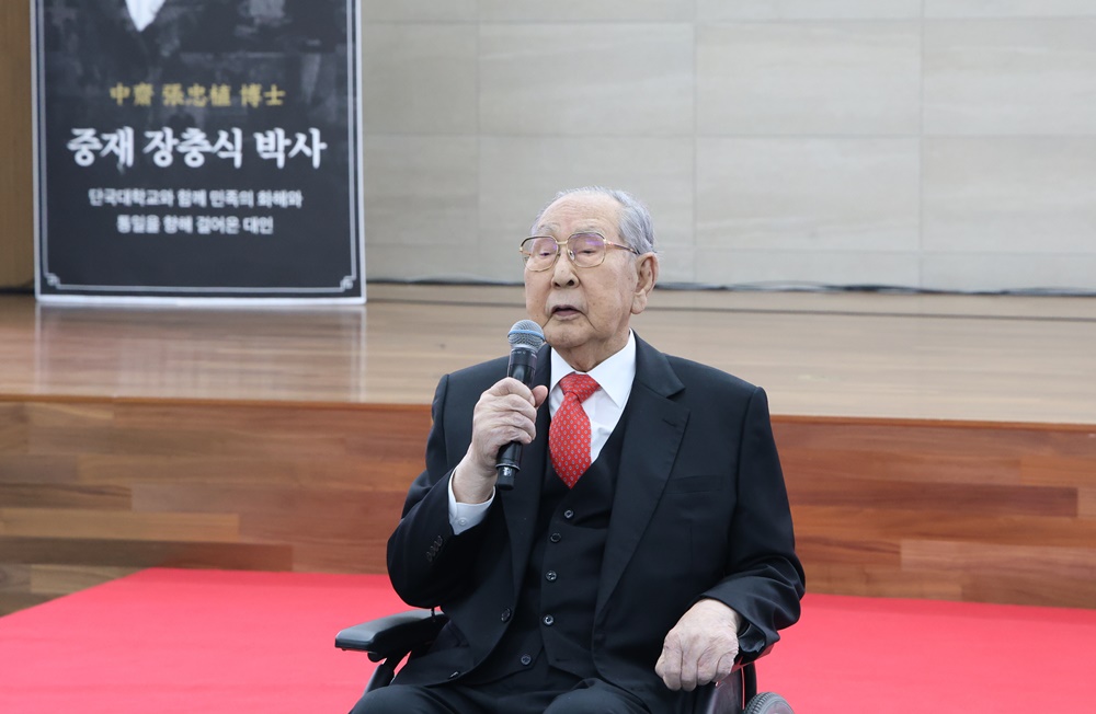 이날 상영된 기념 영상 「시대를 넘어 미래를 열다―단국의 큰 스승, 중재 장충식」은 장충식 명예이사장의 청년기, 대학 발전 과정, 세계 평화와 스포츠 업적 등을 담아 의미를 더했다.