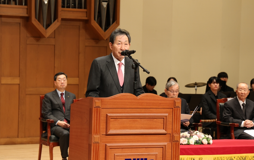 ▲장충식 명예이사장이 행사에서 헌신과 사랑으로 걸어온 60여 년의 교직 인생을 회고하고 있다.