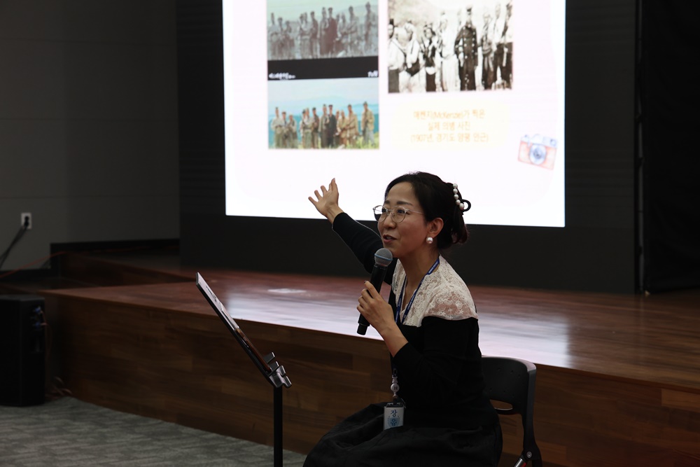 ▲장유정 원장이 학생들에게 독립운동 노래 변천사에 대해 설명하고 있다.