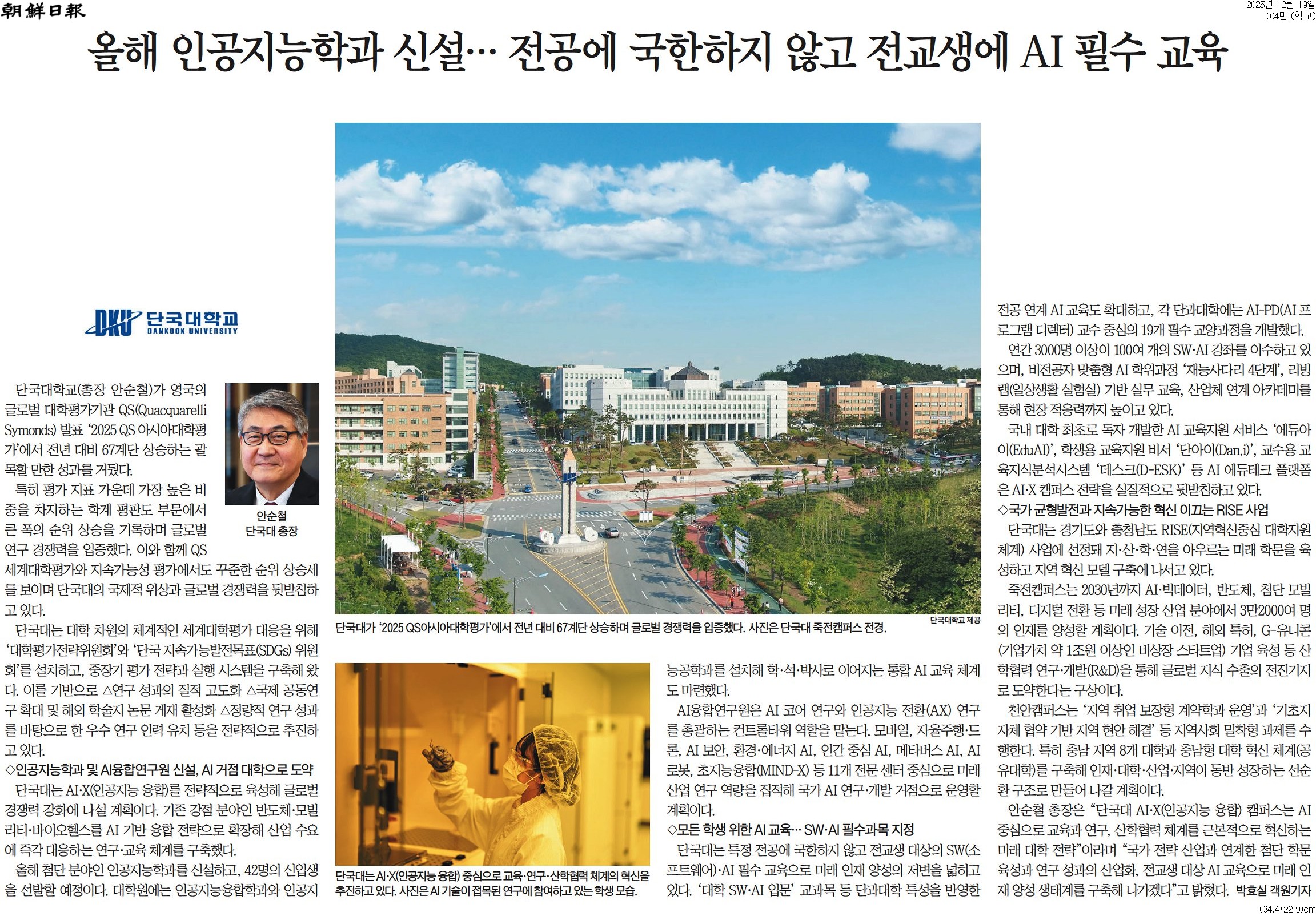 “전교생 AI 교육, AI‧X 캠퍼스 구축”… 미래형 캠퍼스로 대전환 국내 주요 언론사가 우리 대학의 AI‧X(인공지능융합, AI Transformation) 캠퍼스 구축을 중심으로 한 미래형 캠퍼스 대전환 성과를 잇달아 조명했다. 언론은 우리 대학이 AI를 교육과 연구는 물론 행정 전반까지 확장해 전교생 AI 교육 체계를 구축하고, AI·반도체·모빌리티·바이오헬스 등 국가 전략 산업과 연계한 융합 교육·연구를 강화하고 있다고 전했다. 특히 전공의 경계를 넘어 모든 학생이 AI 역량을 갖출 수 있도록 교육 패러다임을 전환한 점에 주목했다. 이와 함께 세계대학평가 대응을 위해 ‘대학평가전략위원회’와 ‘단국 SDGs 위원회’를 설치하고, 중장기 평가 전략과 실행 체계를 구축한 점도 집중 조명했다. 그 결과 ▲2026 QS 세계대학평가 3년 연속 순위 상승 ▲2026 QS 아시아대학평가 전년 대비 67계단 상승(200위권 첫 진입) ▲2026 QS 지속가능성평가 전년 대비 165계단 상승 등 괄목할 만한 성과를 거뒀다고 조명했다.