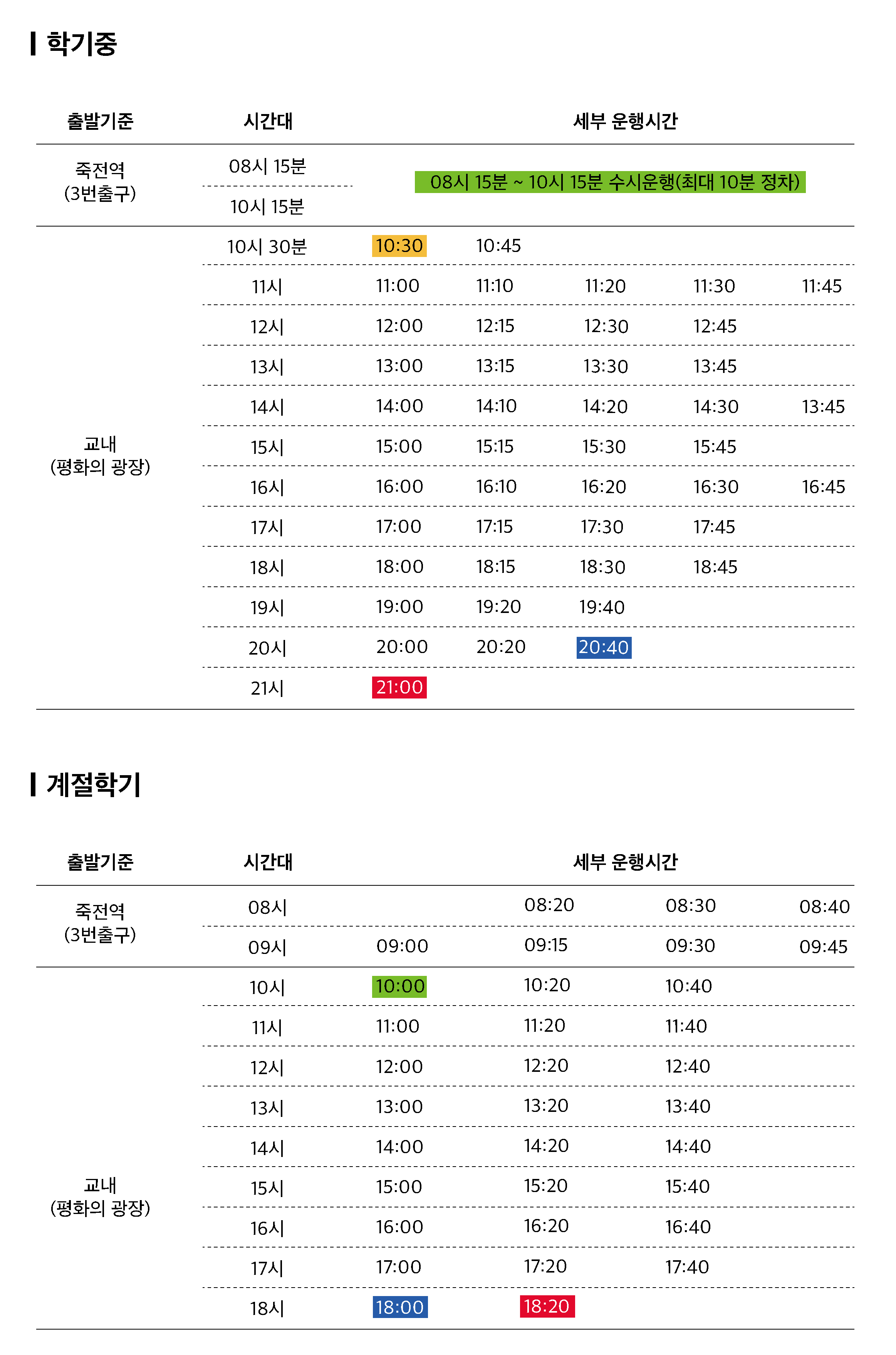 - 21:00 교내(평화의광장)에서 죽전역까지만 운행