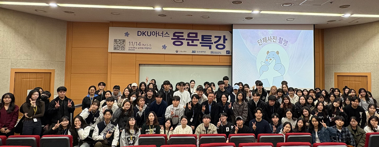 DKU아너스센터(센터장 임수경)는 지난 14일(금) 죽전캠퍼스 글로컬산학협력관에서 김대홍 동문(무역학과 86학번, 그래비티벤처스 부사장)을 초청해 '꿈'을 주제로 한 동문 특강을 개최했다. △김대홍 동문(무역학과 86학번, 그래비티벤처스 부사장)이 '꿈'을 주제로 특강을 하고 있다. 김 동문은 동원증권, 미래에셋증권을 거쳐 카카오페이증권 대표이사를 역임하며 30여 년간 금융 경력을 쌓은 뒤 현재 초기 스타트업 전문 엑셀러레이터 '그래비티벤처스'에서 투자·육성 전문가로 활동하고 있다. 이날 강연에서 김 동문은 ▲미국 빅테크 기업 동향 ▲금융투자 업계 흐름 ▲스타트업 육성과 글로벌 진출 전략 등을 폭넓게 소개하며 현실적인 조언들을 전했다. 특히 김 동문은 “AI기술이 산업 전반을 재편하는 시대에는 자격증 취득, 외국어 공부 등 스펙 쌓기 만으로는 경쟁력이 되기 어렵다"며 "여행을 비롯한 다양한 경험을 통해 상상력을 키우고 이를 바탕으로 구체적인 꿈을 설계해야 한다"고 조언했다. △DKU아너스 학생들이 기념촬영을 하고 있다. 강연 직후에는 금융·투자업계 진출 전략과 창업 관련 질문이 쏟아졌으며 학생들은 특강 종료 후에도 남아 개인적인 질의응답을 이어가는 등 높은 관심을 보였다. 임수경 DKU아너스센터장은 "김대홍 동문의 강연이 DKU아너스 학생들이 모험가적 시각을 갖고 스스로 좋아하는 일을 찾아가는 데 중요한 계기가 되길 바란다"고 밝혔다. 한편, DKU아너스는 우리 대학이 운영하는 리더십 양성 프로그램으로 동문 명사를 초청한 특강을 정기적으로 진행하고 있다. 다음 행사는 오는 12월 5일(금) 혜당관 학생극장 및 로비에서 개최되는 ‘아너스데이’(아너스 과제전 및 성과 발표회)이다. #단국대 #DKU아너스센터 #특강 #김대홍 #동문특강 #그래비티벤처스 [대학뉴스 제보] 죽전 홍보팀 : 031-8005-2032~5, 천안 홍보팀 : 041-550-1061