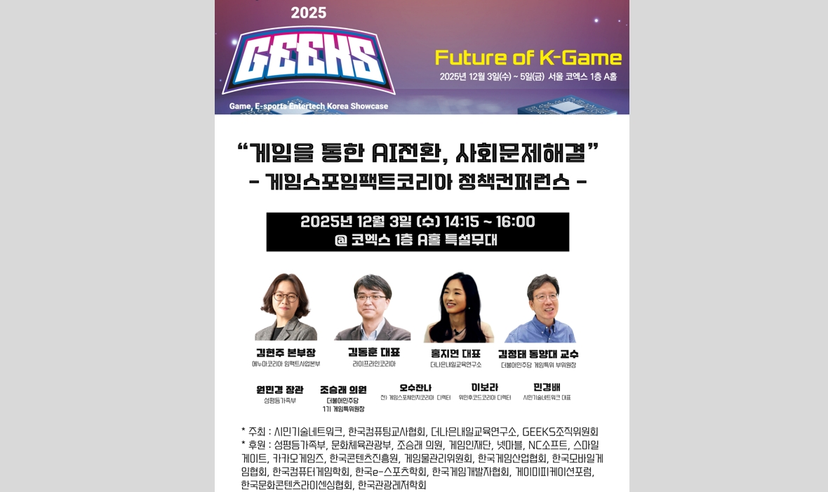 “국내 최대 청년 콘텐츠 쇼케이스… 게임·AI·e스포츠 미래 정책 논의 총괄해” 김세윤 교수(대학원 e-스포츠학과)가 대한민국 대표 청년 콘텐츠 쇼케이스 ‘GEEKS 2025’의 조직위원장을 맡아 행사 기획과 국제 협력을 총괄한다. 올해 GEEKS는 역대 최다 대학이 참여한 가운데 12월 3일(수)부터 5일(금)까지 코엑스에서 열리며, 게임·웹툰·영상·e스포츠 등 청년 창작자의 우수 작품들이 대거 출품돼 국내외 업계의 관심을 모으고 있다. ▲ 김세윤 교수가 조직위원장을 맡아 운영하는 ‘GEEKS 2025’ 포스터 GEEKS는 게임, 엔터테인먼트, AI콘텐츠 분야의 차세대 창작자들이 아이디어를 실현하고 글로벌 무대에 도전하도록 지원하는 창작 생태계 플랫폼이다. 김 교수는 AI 기반 콘텐츠 창작과 글로벌 협력 확대를 목표로 프로그램을 총괄하고, 국내외 산업계와의 연계를 강화할 예정이다. 행사 기간에는 게임·AI 정책을 논의하는 ‘게임스포임팩트 컨퍼런스’와 DMZ ‘K컬처페스타’ 연계 글로벌 협력 프로그램도 운영된다. 김세윤 교수는 “AI 시대에 맞는 게임·e스포츠·콘텐츠 창작 생태계를 견인하는 대표 플랫폼으로 GEEKS를 발전시키겠다”고 밝혔다.