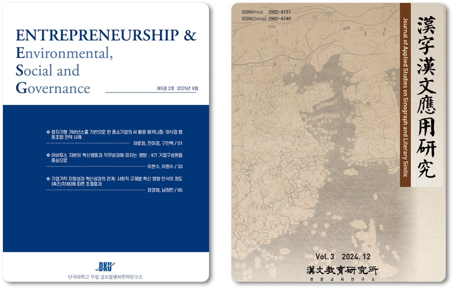 우리 대학 부설 글로벌벤처전략연구소(소장 남정민)와 한문교육연구소(소장 김우정)가 발간하는 학술지가 한국연구재단이 주관한 2025년도 학술지 평가에서 각각 한국학술지인용색인(KCI) 등재학술지와 등재후보학술지로 선정됐다. 한국연구재단은 학술지의 관리 체계와 질적 수준 향상을 위해 매년 학술지 평가를 실시하고 있다. 등재후보학술지 계속 평가에서 85점 이상을 획득한 학술지는 등재학술지로 승격되며, 신규 평가에서 80점 이상을 획득한 학술지는 등재후보학술지로 선정된다. KCI 선정은 학술지의 질적 수준과 학문적 기여도를 인정받았음을 의미한다. 글로벌벤처전략연구소 『Entrepreneurship&ESG 연구』, KCI 등재학술지 승격 △글로벌벤처전략연구소가 발간하는 학술지 『Entrepreneurship&ESG 연구』 글로벌벤처전략연구소가 발간하는 학술지 『Entrepreneurship&ESG 연구』는 2023년 등재후보학술지 선정 이후 2년 만에 KCI 등재학술지로 승격됐다. 2021년 창간된 이 학술지는 창업과 기업가정신을 중심으로 ESG, 지속가능경영, 스타트업 및 중소기업 전략, 창업 정책과 제도 분석 등 이론과 실무를 아우르는 융합 연구를 다뤄왔으며 현재까지 총 50편의 논문을 게재했다. 남정민 소장은 “이번 등재는 창업과 ESG 융합 연구 분야에서 학술지의 신뢰성과 성장 가능성을 공식적으로 인정받은 결과”라며 “국제 학술대회 개최와 해외 학자 참여 확대 등을 통해 국제적 학술 플랫폼으로 발전시키겠다"고 밝혔다. 한편, 글로벌벤처전략연구소는 2016년 설립 이후 창업·벤처 정책 연구와 기업가정신, 창업생태계 분석 등을 중심으로 학문과 산업 현장을 연결하는 실천적 연구를 수행해 오고 있으며, 학술지 발간을 통해 축척된 연구성과를 대학의 창업 교육과 지원 정책에 연계하며 창업 생태계 강화에 기여하고 있다. 연구소는 2026년부터 학술지명을 '미래융합연구논문지'로 변경해 미래 사회 전반의 융합 이슈를 폭넓게 다룰 계획이다. 한문교육연구소 『한자한문응용연구』, KCI 등재후보학술지 선정 △한문교육연구소가 발간하는 학술지 『한자한문응용연구』 한문교육연구소가 발간하는 학술지 『한자한문응용연구(漢字漢文應用硏究)』는 이번 평가에서 KCI 등재후보학술지로 선정됐다. 『한자한문응용연구』는 동아시아 한자·한문 교육과 이를 기반으로 한 다양한 응용 연구를 다루는 학술지로 2022년 창간 이후 연 1회 발간되고 있다. 최근에는 연구 영역을 디지털 인문 고전학으로 확장해 연구성과를 공유하고 있으며 지난달 31일 제4호를 발간했다. 김우정 소장은 "동아시아 인문 고전의 기초 자산인 한자·한문 연구의 지평을 확장하고 디지털 전환 시대에 부합하는 연구 방향을 제시함으로써 동아시아 한문고전과 디지털 인문학 분야를 대표하는 학술지로 자리매김하겠다”고 말했다. 한편, 한문교육연구소는 2016년 설립 이후 디지털 인문학 방법론을 활용한 한문고전 연구를 중심으로 동아시아 인문학 연구의 현대적 확장을 추진해오고 있다. 인공지능과 데이터 기반 연구를 접목한 학제 간 연구를 수행하는 한편, '한연연구총서', '한연번역총서', '중국 인민대학과 디지털인문학 총서' 발간 등을 통해 연구 성과를 체계적으로 공유하고 있다.