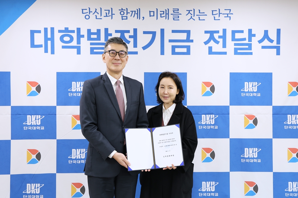 (재)신주장학재단(이사장 강혜승, 디자인학부 교수)이 6일(화) 김재일 대외부총장을 찾아 대학 발전에 써달라며 1천만 원을 기탁했다. 누적 기부금은 2천만 원이다. 전달식에는 김재일 대외부총장, 신은종 대외협력처장, 강혜승 이사장(디자인학부 교수) 등이 참석했다. ▲ 발전기금 전달식 (왼쪽부터 김재일 대외부총장, 강혜승 이사장) ▲ 발전기금 전달식 단체 사진 강혜승 이사장은 “아버지이신 故강신주 회장께서 평생 강조해 오신 ‘인재 육성’의 뜻을 이어, 대학이 미래 인재를 키우는 든든한 터전이 되길 바라는 마음으로 기탁을 이어가고 있다”라며 “학생들이 배움에 전념하며 사회에 기여하는 인재로 성장하길 진심으로 응원한다”고 밝혔다. 김재일 대외부총장은 “우수 인재 양성에 사랑과 관심을 가져주셔서 감사드린다”라며 “기탁해 주신 발전기금은 대학의 교육·연구 환경을 강화하고 미래 인재를 양성하는 데 소중히 사용하겠다”라고 밝혔다. 한편 ㈜삼신 창업주인 故강신주 회장은 지난 2023년, 인재 육성에 대한 평생의 뜻을 실현하고자 (재)신주장학재단을 설립했다. 재단은 ‘젊은 인재가 우리나라의 미래다’라는 강신주 회장의 유지를 이어 지난 3년간 총 119명의 학생을 후원하며 인재 양성에 힘쓰고 있다. [대학뉴스 제보] 죽전 홍보팀 : 031-8005-2032~5, 천안 홍보팀 : 041-550-1061