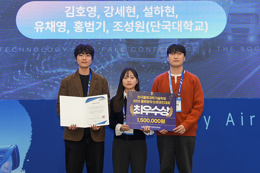 경영공학과 재학생 연구팀이 물류 분야 주요 학술대회에서 잇따라 수상하며 데이터·AI 기반 연구 역량을 입증했다. △김호영 팀이 최우수상을 수상하며 상금 150만 원을 거머쥐었다. 김호영 팀은 한국물류과학기술학회가 주최한 「2025 물류분야 논문경진대회」에서 최우수상을 수상했다. 경영공학과 김호영·강세현·설하현·유채영·홍범기(이상 경영공학과 4학년) 학생으로 구성된 김호영 팀은 특허 데이터를 활용해 스마트 물류 분야의 주요 기술 흐름과 공백기술을 정량적으로 분석하고, 데이터 기반 R&D 전략을 제시한 논문 「스마트 물류 기술 동향 분석을 위한 특허 데이터 기반 토픽모델링 및 기술 기회 분석」으로 최우수상을 받았다. 김호영 학생은 “데이터 기반의 정량적 의사결정 프레임워크를 설계한 연구가 유의미한 성과로 인정받아 기쁘다”며 “제안한 기술 예측 방법론이 향후 다양한 산업 분야의 의사결정 고도화에 폭넓게 활용되길 기대한다”고 밝혔다. △김현정 팀이 2025년 물류데이터 활용 및 분석 아이디어 공모전에 이어 2025년 공급망 안정화 대국민 정책연구대회에서 우수상을 수상했다. 이어 김현정 팀은 「2025년 공급망 안정화 대국민 정책연구대회」에서 우수상을 수상했다. 해당 대회는 산업통상자원부가 주최하고 한국정책학회와 기술경영경제학회가 주관한 정책연구 중심의 전국 단위 논문 공모대회다. 경영공학과 김현정 학생(4학년)과 대학원 산업공학과 우민수·김정음 씨로 구성된 김현정 팀은 미국 인플레이션감축법(IRA) 시행에 따른 글로벌 공급망 변화에 대응하는 통합 의사결정 모형인 「음극재 공급망 최적화를 위한 전략적 소싱-재고관리 통합 의사결정 모형」을 제시해 우수한 평가를 받았다. 우민수 씨는 “이차전지 공급망이 겪는 현실적인 리스크를 데이터를 통해 분석하고, 수학적 최적화로 해결책을 모색한 경험이었다”며 “앞으로도 데이터에 기반해 복잡한 산업 문제를 해결하는 최적화 연구를 이어가겠다”고 소감을 밝혔다. 두 팀의 지도를 맡은 조성원 교수(경영공학과)는 “학생들이 복잡한 물류 환경 속 실제 산업 문제를 깊이 고민하고, 데이터와 AI 기반 방법론으로 실질적인 해결책을 제시했다는 점이 매우 고무적”이라며 “이번 경험을 바탕으로 산업과 사회에 기여하는 데이터·AI 기반 연구가 더욱 확장되길 바란다”고 전했다. 한편 김현정 팀은 이번 수상에 앞서 대전정보문화산업진흥원이 주관한 「2025년 물류데이터 활용 및 분석 아이디어 공모전」에서도 우수상을 수상한 바 있다. 이로써 경영공학과 재학생 연구팀은 물류·공급망 분야 주요 학술·공모대회에서 연이어 성과를 거두며, 데이터 기반 연구 경쟁력과 실무 적용 가능성을 동시에 입증했다. [대학뉴스 제보] 죽전 홍보팀 : 031-8005-2032~5, 천안 홍보팀 : 041-550-1061