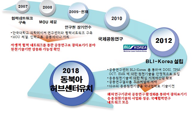 - 광진단 분야의 세계적 연구 기관인 Beckman Laser Institute와 의료용 레이저 개발 경험이 풍부한 단국대학교 의학레이저 연구센터가 상호간의 원천 기술을 공유하고 이를 바탕으로 광진단 및 치료기기를 연구 개발하고 국내 광의료 분야 연구를 세계 일류 수준으로 끌어올리기 위하여 한국베크만 광의료기기 연구센터(BLI-Korea)를 설립함.