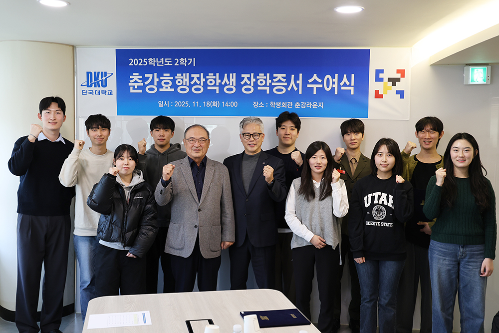 우리 대학이 18일 천안캠퍼스 춘강라운지에서 효자·효녀에게 전하는 특별 장학금인 춘강효행장학금 수여식을 갖고, 재학생 10명에게 총 2천만 원의 장학금을 전달했다. △박광수 씨(왼쪽 다섯 번째)와 춘강효행장학생, 이일석 학생처장(가운데)이 기념사진을 촬영했다. 춘강효행장학금은 지난 2008년 우리 대학 동문인 춘강 故박상엽 선생이 모교에 기탁한 10억 원을 기반으로 설립된 장학금이다. 지난 2023년에는 아버지의 유지를 이어 아들인 박광수 씨가 1억 원을 추가 기부하며 효행 장려의 뜻을 이어갔다. 춘강효행장학금은 다른 장학금과 달리 기부자의 뜻에 따라 성적이나 특기가 아닌 ‘효행’만을 기준으로 장학생을 선발하고 있다. 지난 15년 동안 220여 명의 학생들에게 총 4억 3천여만 원의 장학금이 전달됐다. 어머니의 암 투병을 지키며 학업과 가정을 돌본 사연, 시각장애인이신 아버지와 간질환을 앓고 있는 어머니의 밑에서 책임과 헌신을 배우며 부모님께 받은 사랑을 주변 사람들에게 나누고 싶다는 애틋한 사연 등이 소개되며 많은 이들에게 귀감이 되었다. 장학생 김동윤 학생(식품자원경제학과 2학년)은 “나눔과 봉사는 일상 속 작은 행동에서 시작한다" 라며 “효와 선행이라는 가치를 되새기며 베풀 수 있는 사람이 되어 나눔의 가치를 실천하고 싶다”고 소감을 밝혔다. 수여식에 참석한 박광수 씨는 “장학금을 잘 운영해 주는 학교에 감사하다”며 “때때로 마음이 울컥할 만큼 힘든 사연을 가진 학생들이지만 밝은 얼굴을 보면 미래가 더욱 든든해진다. 여러분의 장래가 밝고 지경이 넓어지길 진심으로 바란다”고 전했다. [대학뉴스 제보] 죽전 홍보팀 : 031-8005-2032~5, 천안 홍보팀 : 041-550-1061
