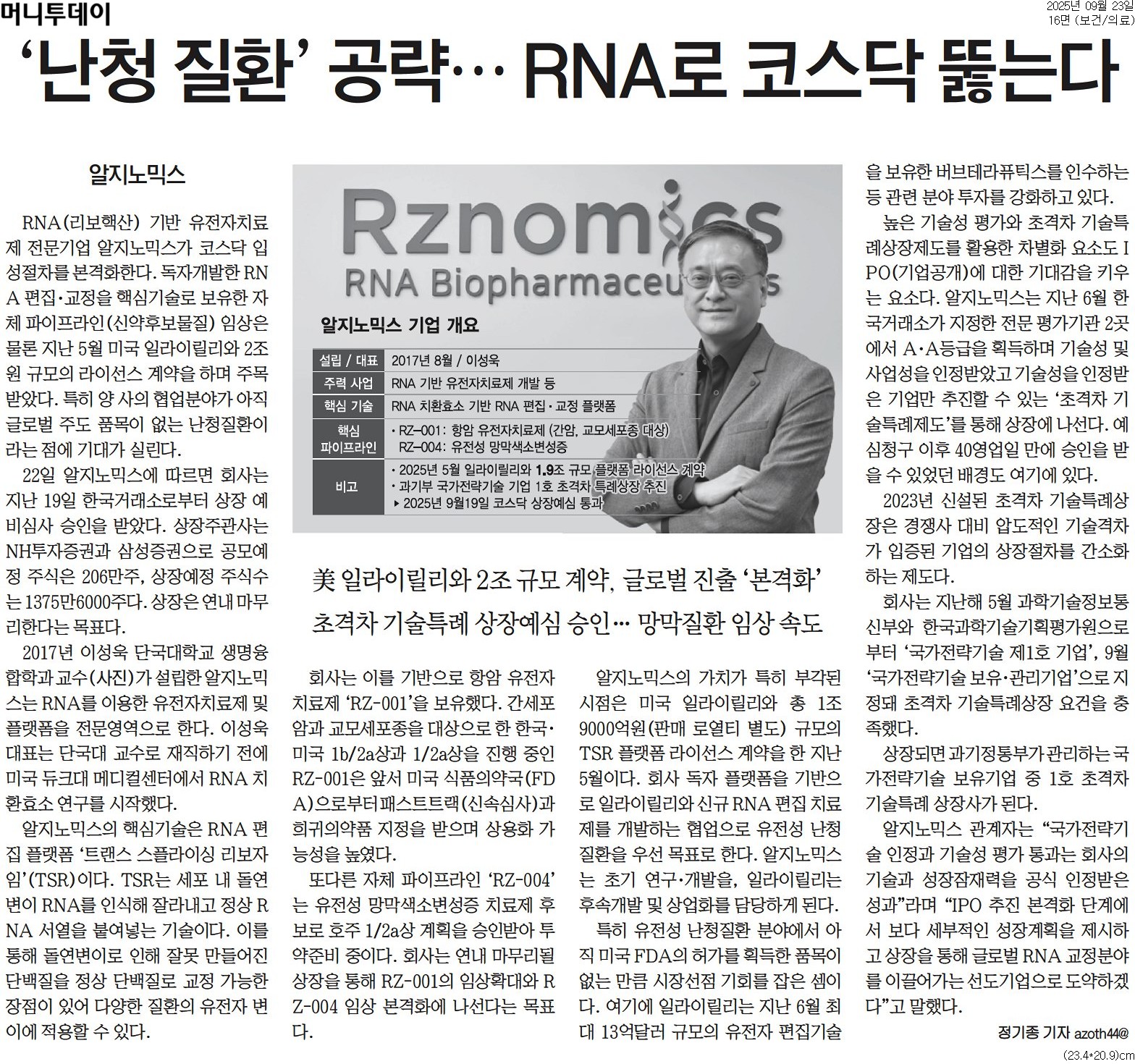 19일(금) 코스닥 상장예심 통과…RNA 치환효소 기반 편집·교정 기술 독보적 산학협력단 기술지주회사 자회사 알지노믹스(주)(대표 이성욱 교수, 대학원 생명융합공학과)가 코스닥 상장 예비심사을 통과하며 초격차 기술특례 1호 기업 상장을 눈앞에 뒀다. 알지노믹스는 한국거래소로부터 지난 19일(금) 상장 예비심사 승인을 통과했다. 상장 주관사는 NH투자증권과 삼성증권으로 공모 예정주식은 각각 206만주, 상장 예정주식은 1,375만 6,000주로 본격적인 상장 절차에 돌입, 연내 상장을 마무리한다는 목표다. 알지노믹스는 RNA 편집 기술을 기반으로 희귀·난치질환 치료용 유전자치료제를 개발하는 바이오 벤처기업으로, 2017년 단국대산학협력단 기술지주회사 자회사로 설립해 유전자 치료 분야에서 지속적인 기술 혁신을 이어오고 있다. 알지노믹스는 지난 6월 한국거래소가 지정한 전문평가기관 2곳으로부터 각각 ‘A·A 등급’을 획득하며, 기술력과 사업성을 공식적으로 인정받았다. 앞서 지난해 5월에는 과학기술정보통신부와 한국과학기술기획평가원(KISTEP)으로부터 ‘국가전략기술 제1호 기업’으로 지정됐으며, 9월에는 ‘국가전략기술 보유·관리기업’으로 추가 지정돼 초격차 기술특례상장 요건을 모두 갖췄다. 알지노믹스가 코스닥 상장에 성공할 경우, 과학기술정보통신부에서 관리하는 국내 국가전략기술 기업 가운데 첫 ‘초격차 기술특례상장’ 성공 사례가 된다. 또한 알지노믹스는 지난 5월 글로벌 시총 1위 제약회사인 미국 일라이릴리(Eli Lilly)와 최대 1조 9천억 원 규모의 기술이전 계약을 체결하며 세계 시장에서도 독보적인 기술력을 인정받았다. 이성욱 교수는 “알지노믹스는 세계 최초 RNA 치환효소 플랫폼을 기반으로 기존 한계를 넘어서는 혁신 치료제를 개발하고 있다”라며 “이번 코스닥 상장을 통해 글로벌 무대에서 차세대 RNA 교정 분야를 이끌어가는 선도기업으로 도약하겠다”라고 밝혔다. 안순철 총장은 “알지노믹스의 코스닥 상장 예심 통과는 단국대 산학협력단 기술지주회사가 거둔 혁신적 결실이자, 우리 대학이 축적해 온 연구 역량과 산학협력의 저력을 보여주는 대표적인 성공사례”라며 “앞으로도 단국대는 세계 무대에서 혁신기술을 선도하는 산학협력 모델을 구축하는 데 박차를 가하겠다”고 강조했다. |