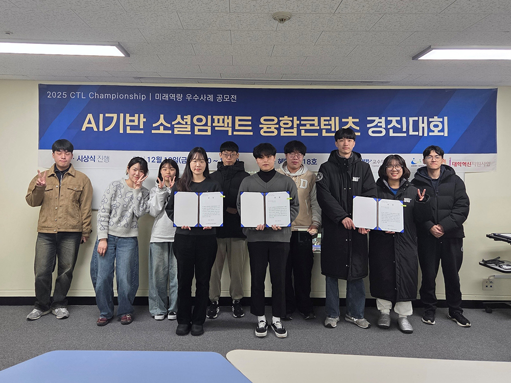 교육혁신원(원장 노지현) 교수학습개발센터가 주관한 ‘AI기반 소셜임팩트 융합콘텐츠 경진대회’가 지난 12일 성황리에 마무리됐다. 생성형 AI를 활용하여 사회 문제를 해결하고 긍정적인 사회적 영향을 창출하는 혁신적인 아이디어를 발굴하기 위해 마련된 이번 공모전은 우리 대학 재학생을 대상으로 팀 부문과 개인 부문으로 나뉘어 운영됐다. 학생들은 생성형 AI와 바이브 코딩을 활용해 지속가능한 미래(SDGs)와 대학 교육혁신에 기여하는 다양한 콘텐츠를 선보였다. △ 죽전캠퍼스 단체사진 △ 천안캠퍼스 단체사진 대회에서는 ▶캠퍼스 제로웨이스트 캠페인 ▶탄소중립 행동 변화를 유도하는 인터랙티브 콘텐츠 ▶AI 기반 학습 큐레이션 서비스 등 실현 가능성과 창의성을 겸비한 작품들이 다수 출품돼 심사위원단의 호평을 받았다. 특히 단순한 아이디어 제안에 그치지 않고 실제 시연과 피칭까지 이어진 본선 무대에서는 학생들이 생성형 AI를 능동적으로 활용해 문제를 정의하고 해결책을 설계하는 과정을 생생하게 보여주며 실질적 역량을 입증했다. 팀 부분에서는 최우수 1팀, 우수 2팀, 장려 2팀을 선발했으며 생성형AI를 활용하여 건강한 생활 습관을 유지할 수 있도록 도와줄 수 있는 게임과 함께 게임 소개 숏폼을 제작한 ‘그로우 루틴 빌리지’ 팀(김민성 외 2명)이 최우수상을 수상했다. 개인 부문에서는 진로, 전공 등의 고민을 안고 있는 대학생들을 위한 앱 제작을 주제로 숏폼과 브랜드키트를 소개한 임주혁 학생(환경원예학과 3학년) 등 5명 학생이 수상의 영예를 안았다. △ 죽전과 천안캠퍼스 이원화 연결을 통해 실시간으로 진행한 시상식 모습 노지현 교육혁신원장은 “이번 CTL Membership 역량 공모전은 생성형 AI 시대에 요구되는 미래 역량을 학생들이 스스로 체득하고 증명한 자리였다”며“앞으로도 학생 주도의 실천형 프로그램을 확대해 창의적 문제 해결 능력과 융합 역량을 지속적으로 강화해 나가겠다”고 밝혔다. 한편 대학혁신지원사업 ‘D-Learning 교수학습 혁신’ 프로그램의 일환으로 기획된 이번 경진 대회는 글로벌 K-컬처 사업단과의 협업을 통해 운영됐다. 특히 디지털 마케팅, 가상 브랜드 개발, 바이브코딩 등 사전 특강과 실습을 통해 AI 활용 역량을 높이고, 이를 실전 과제에 적용하는 방식으로 진행됐다. [대학뉴스 제보] 죽전 홍보팀 : 031-8005-2032~5, 천안 홍보팀 : 041-550-1061